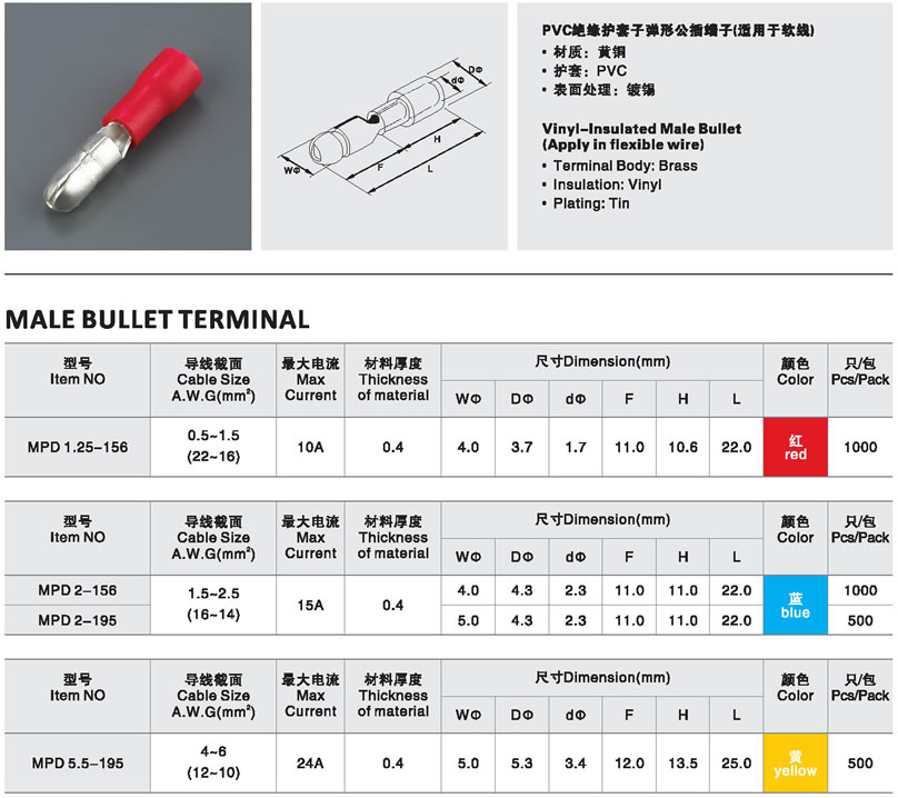 BULLET CONNECTORS (MALE) MPD2-156 10PCS/PKG