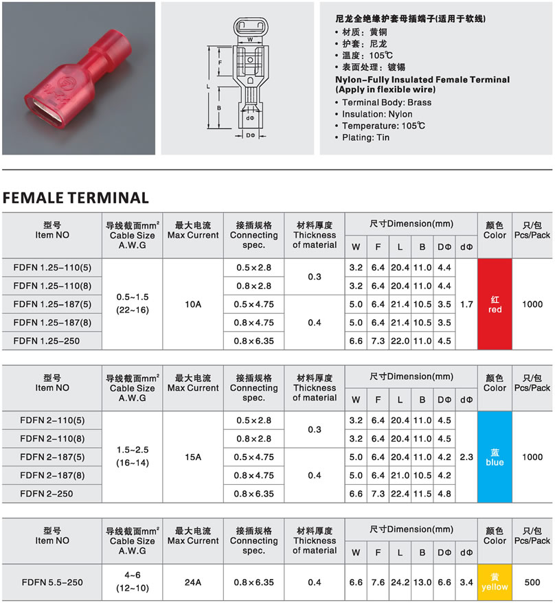 INSULATED QUICK CONNECTOR (F), FDFN 2-250, 1/4"(6.4mm), 16-14AWG 10PCS