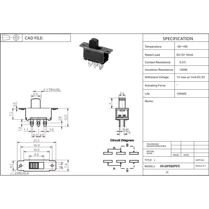 SLIDE SWITCH 6 PIN DPDT ON-ON, 5mm STEM, SS22F25G5